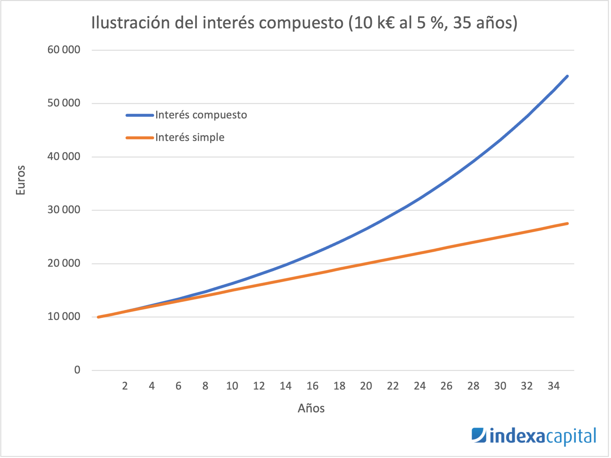 Crecimiento exponencial: como se puede observar en la ilustración, el poder del interés compuesto es que hace crecer tu inversión de forma exponencial en lugar de hacerlo de forma lineal. 10 mil euros invertidos al 5 % anual durante 20 años con reinversión de las ganancias (= con interés compuesto) acaban siendo 55 mil euros en 35 años si reinviertes las ganancias (= interés compuesto, exponencial), el doble que los 27 500 € que obtendrías sin reinvertir las ganancias (= interés simple, lineal).