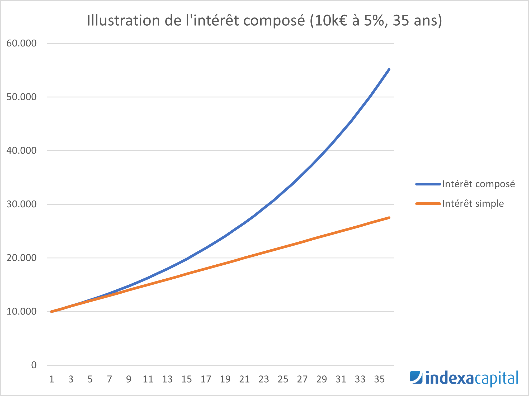 Croissance exponentielle : comme nous pouvons l'observer sur le graphique précédent, l'avantage des intérêts composés est de faire croître votre investissement exponentiellement plutôt que linéairement. 10 mille euros investis à 5% annuel avec réinvestissement des gains (avec les intérêts composés) permettent d'obtenir 55 mille euros après 35 ans si vous réinvestissez les gains (intérêts composés, exponentiel), le double des 27.500€ que vous obtiendriez sans réinvestir les gains (intérêts simple, linéaire).