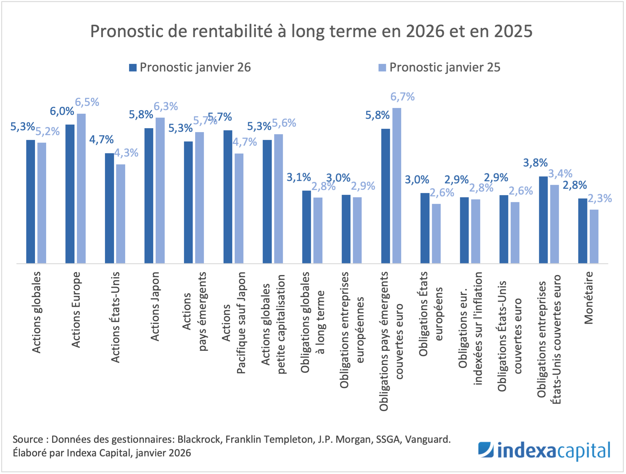 Les pronostics de rentabilité à long terme pour les différentes classes d’actif, actuels (2026) et précédents (2025), sont les suivants :